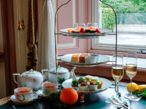 長楽館といえばアフタヌーンティー。 かつて応接室として使われていたロココ様式のお部屋「迎賓の間」は、アフタヌーンティーご利用のお客様専用です。 往時には女性がおしゃべりを楽しんだ華やかな空間では、 英国式アフタヌーンティースタンドにスコーンやサンドウィッチが並び、ケーキやお茶とともに優雅な午後を彩ります。