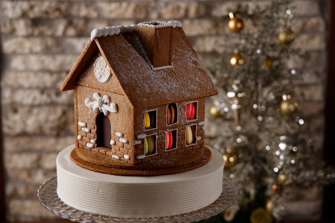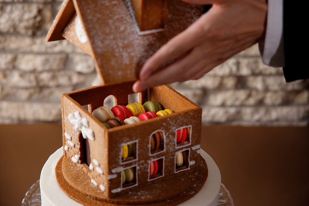 スパイスを効かせた自家製スペキュロスクッキーで外壁をかたどった、お菓子の家のケーキ。可愛らしい見た目の中には、色とりどりマカロンが30個。土台となる苺とクリームを重ねたデコレーションケーキも楽しめる特別な一台です。