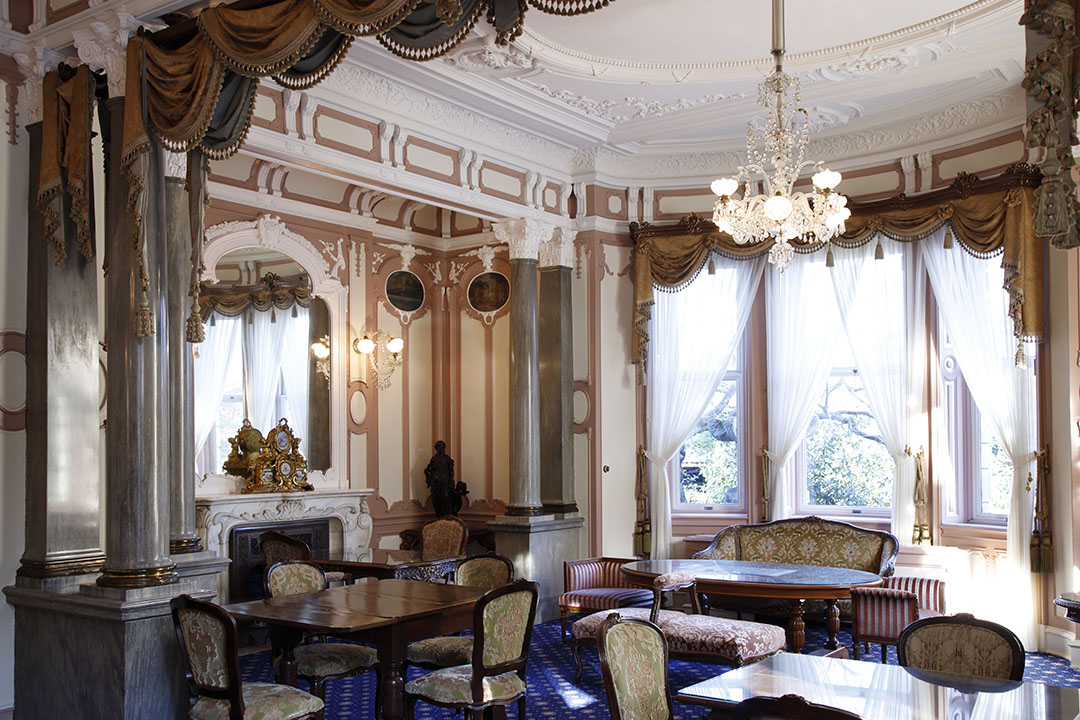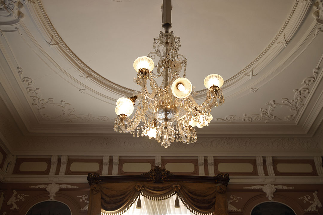 長楽館竣工当時、客人を迎え入れ、お茶と会話を愉しむための応接間として設えられた「迎賓の間」。ロココ様式の優美な内装や、バカラ社製のシャンデリア、明治期から受け継がれる調度品に囲まれた空間は、時代を超えてなお特別なひとときを演出します。