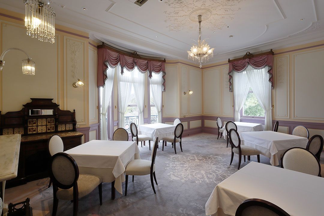 現在も2名様からのアフタヌーンティー専用の一室として、静かで上質な時間をご提供。往時のように、お喋りに花を咲かせながら、季節ごとのテーマのアフタヌーンティーをティーフリーにてお楽しみいただきます。歴史ある空間そのものを味わう、長楽館ならではのティータイムをお楽しみいただけます。