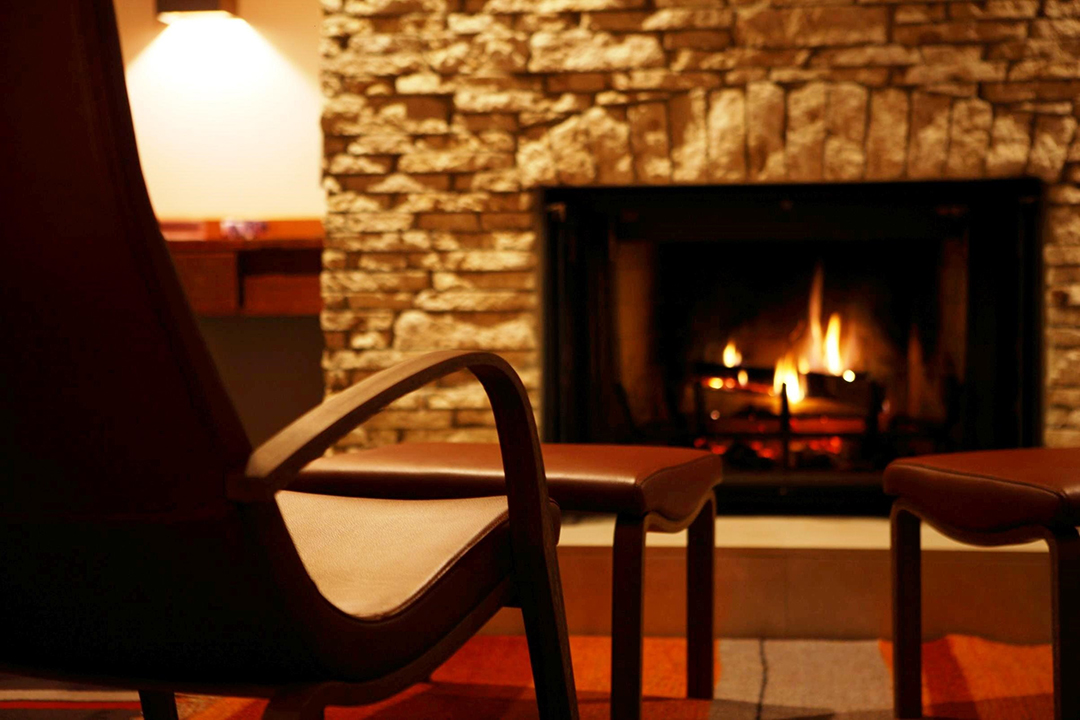 冬のステイを豊かにする薪の暖炉。