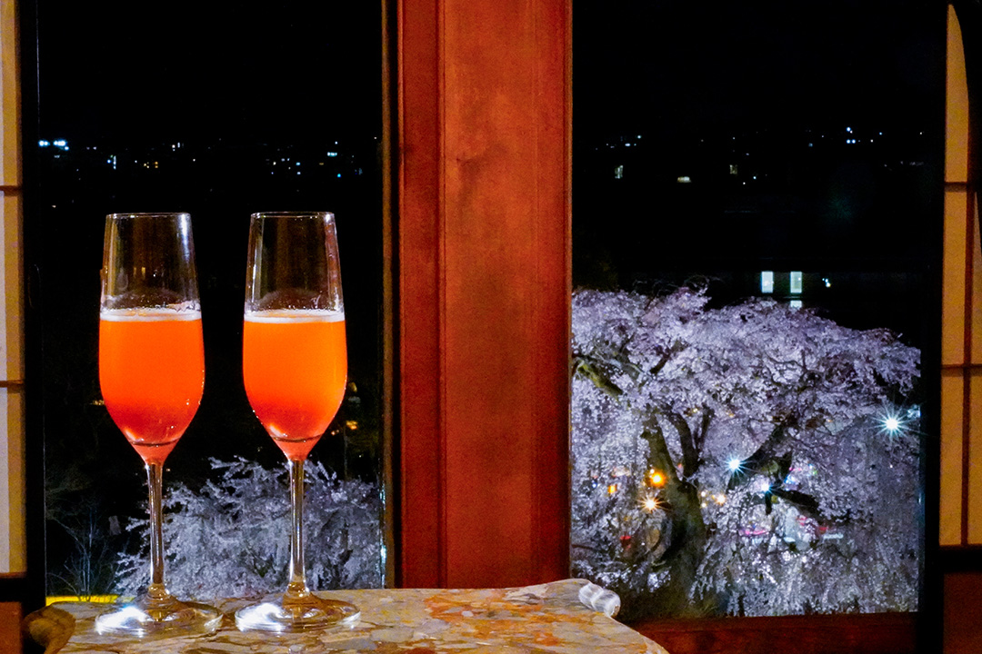 京都の春を象徴する特別な場所へ、お食事の前にご案内いたします。 通常非公開の和室「御成の間」。華頭窓の向こうに広がる円山公園の夜桜を眺めながら、苺のカクテルまたはロゼシャンパーニュで乾杯。