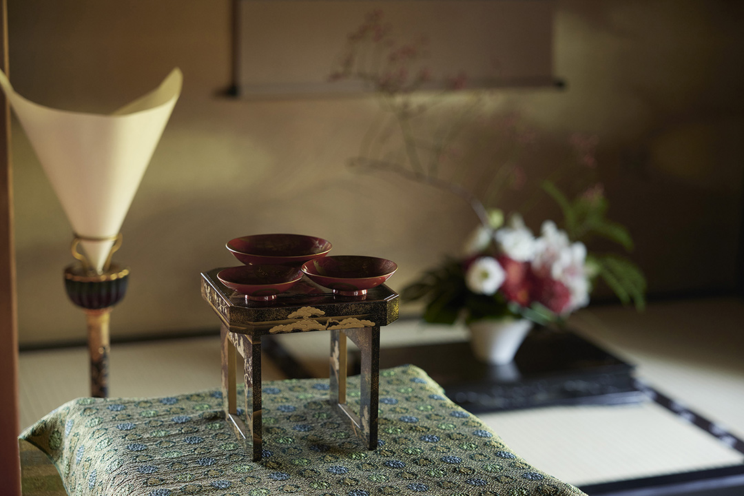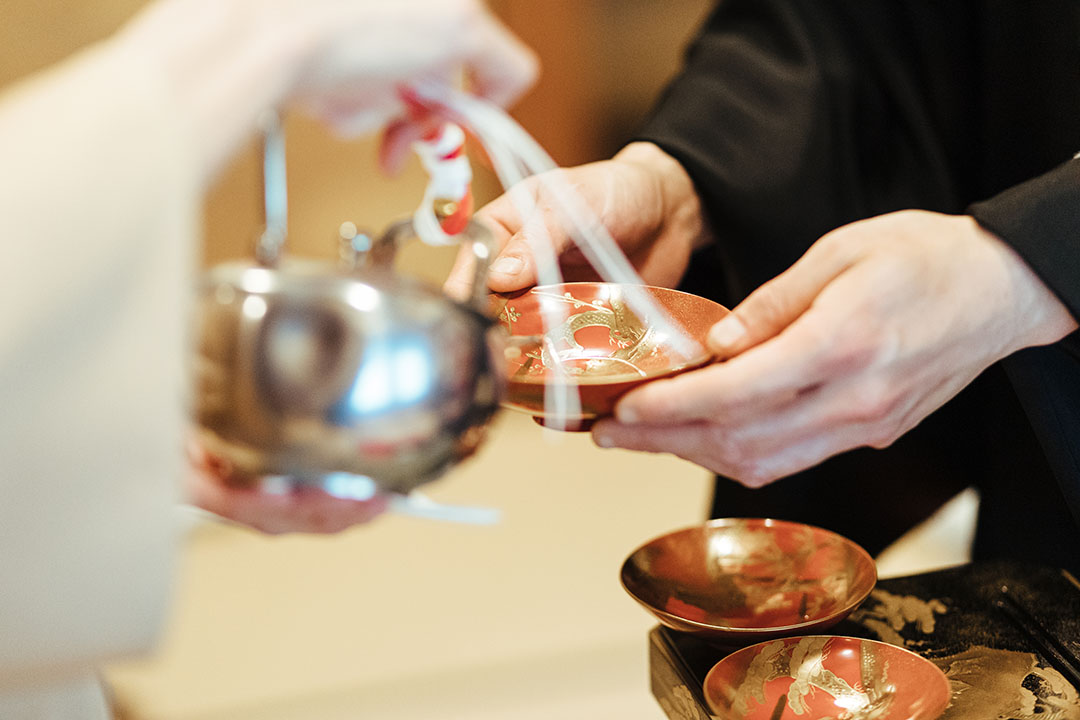 円山公園に佇む長楽館、普段は立ち入れない「御成の間」で執り行われる祝言は、静謐さと品格に満ちた和の婚礼です。雅楽の音色が響く中、折上格天井や床の間、付書院を備えた美しい書院造の和室で、家族に見守られながら厳かに式が進みます。