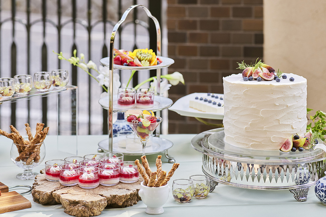 本プランでは、女性に好評のスイーツブッフェもお楽しみいただけます。バンケットルーム「テラスコーラル」の前庭は造園家・北山安夫氏が手掛けたもの。ナチュラルなサンゴ石が敷き詰められたテラスでは、デザートカフェ長楽館のパティシエが手掛けるウエディングケーキやスイーツが、明るい光に照らされながら、皆様をお迎えいたします。