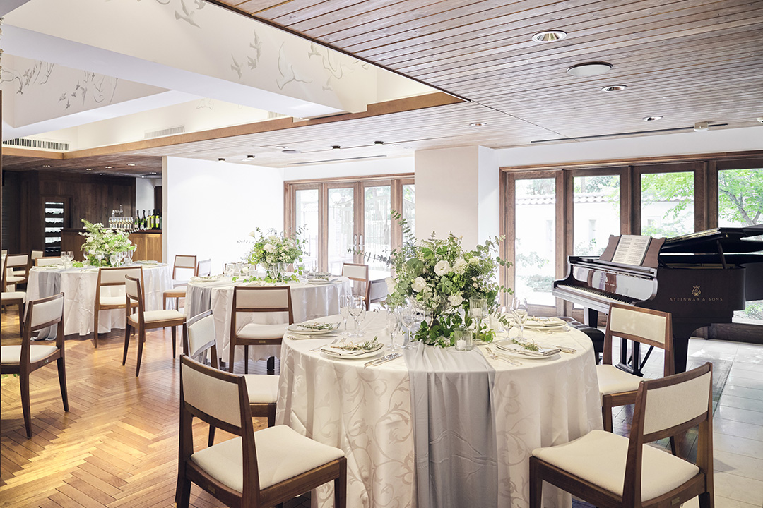新館1階のテラスコーラルでは、緑に囲まれた開放的な空間で記念撮影ができるほか、フラワーシャワーやデザートビュッフェなどさまざまな演出で大切な式を盛り上げます。笑い声の響く和やかな披露宴をお考えのお二人にぴったりの会場です。